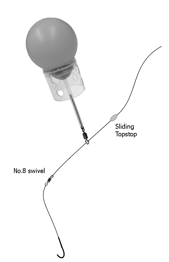 Feeders attached with a sliding stop on your line, then threaded through the feeder link /swivel then stopped by 2 No.4 shot, with hooklength = 45cm.